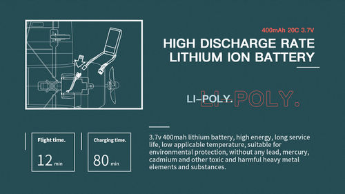 7. Standard battery LI-POLY 3.7V (400MAH) 20C, super endurance gliding flight for about 12 minutes.
