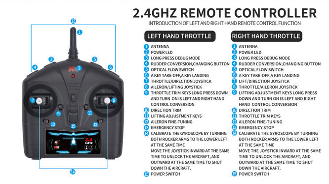 4-channel remote controller, low voltage alarm, large and small rudder conversion and other functions. Specially set the mid point of hovering to enter the setting mode